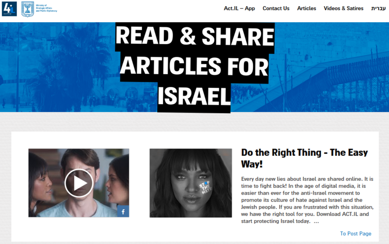 The website set up by the Ministry of Strategic Affairs to help users of its “Act.il” app to spread Israeli propaganda online.