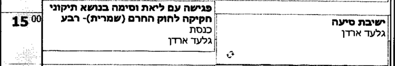 With the subject “BDS law,” the entry reads, “A meeting with Liat and Sima on legislation amendments to the Boycott Law.” (Erdan’s staff at the ministry are referred to throughout the diary by their first names.)