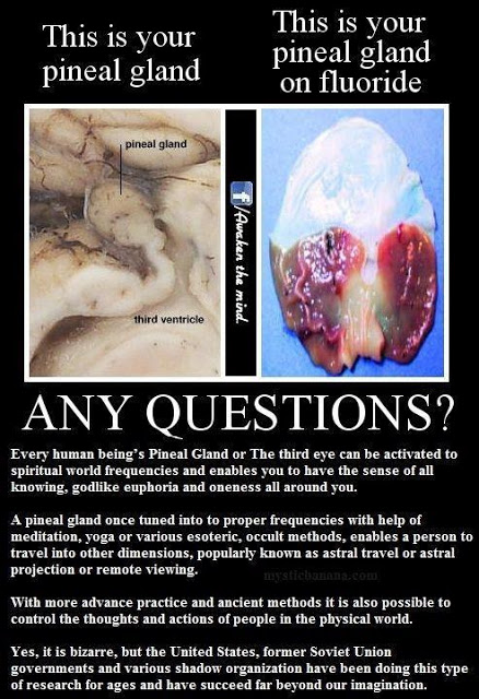 Flouride is the most common and widespread in our diets. It is magnetically attracted to the pineal gland more so than any other part of the body. Here it forms calcium phosphate crystals which accumulate.Fluoride is present in toothpastes and tap water. It’s a heavy duty poison and should be avoided at all costs as it calcifies the pineal tissue and basically shuts the gland down. Switch to a fluoride-free toothpaste and drink spring water or filtered water (see ‘Tap Water’ section below for more information).