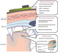 Their idea is to sprinkle electronic sensors the size of dust particles into the cortex and to interrogate them remotely using ultrasound. The ultrasound also powers this so-called neural dust.