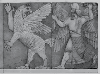 Tablet I contains a creation myth about the Sumerian gods Anu, Enlil, and Enki, gods of sky, wind, and water, “when gods were in the ways of men” according to its incipit. Following the Cleromancy (casting of lots), sky is ruled by Anu, earth by Enlil, and the freshwater sea by Enki. Enlil assigned junior divines[6] to do and maintain the rivers and canals, but after forty years the lesser gods or dingirs rebelled and refused to do strenuous labor. Instead of punishing the rebels, Enki, who is also the kind, wise counselor of the gods, suggested that humans be created to do the work. The mother goddess Mami is assigned the task of creating humans by shaping clay figurines mixed with the flesh and blood of the slain god Geshtu-E, “a god who had intelligence” (his name means “ear” or “wisdom”).[7] All the gods in turn spit upon the clay. After ten months, a specially made womb breaks open and humans are born. Tablet I continues with legends about overpopulation and plagues. Atrahasis is mentioned at the end of Tablet I.
