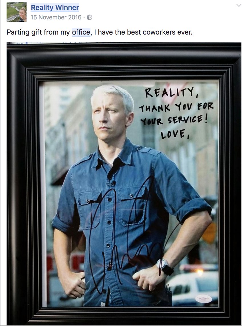 Accused NSA source Reality Leigh Winner Facebook post from November 2016 shows signed image of CNN's @andersoncooper