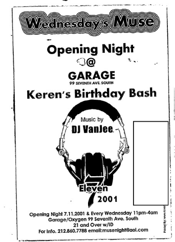 | Section 1, page 12. Flyer found for party at the Garage on 99 7th Avenue in Manhattan. The date "7-11" (exactly 2 months before 9-11) is prominent. Is the address (99 7th Avenue - 99 = 9x11) significant? Keren is a common Israeli women's name. What is being covered up on the right side of the flyer? Below a snippet from a Google search for DJ VanJee that refers to Jaffa, a city located in Israel. |