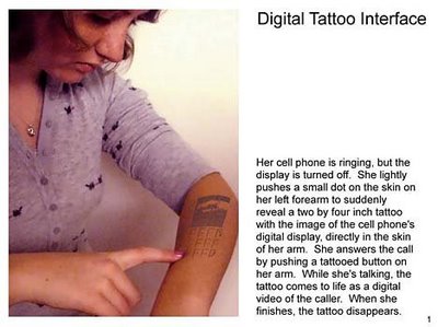 One of the many prototypes of future cell phone applications is an implanted cell phone with a digital tattoo interface. This was entered in the 2008 Greener Gadgets Competition. (Image source: Gizmodo.com.au)