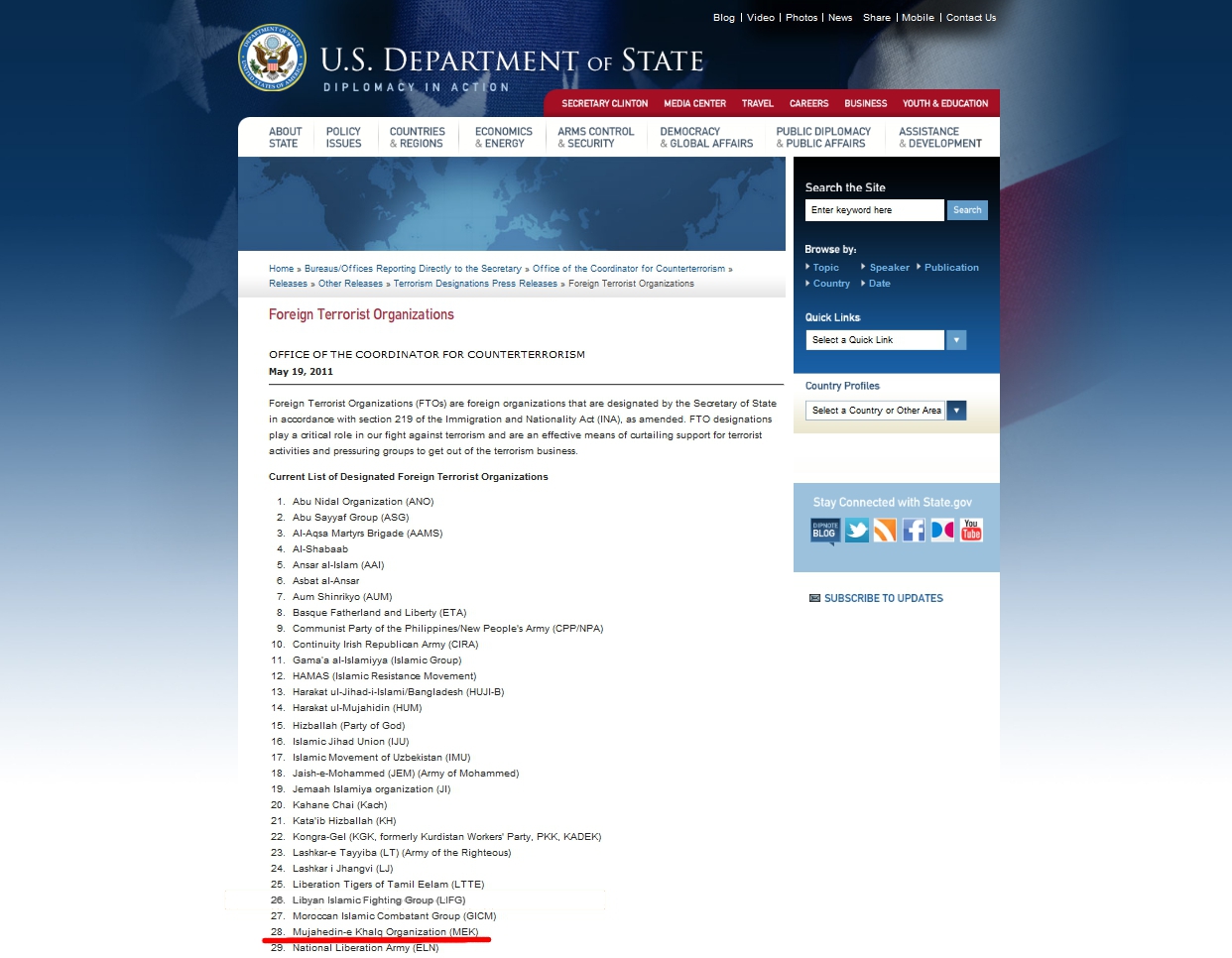 Image: A screenshot from the US State Department's website showing MEK listed as a "Foreign Terrorist Organization" and listed as "29. Mujahedin-e Khalq Organization (MEK)." Paradoxically the US State Department is currently aiding and abetting the organization, with its efforts, along with the UN, British and Israeli government's, being the sole factor keeping the organization in existence. (click on image to enlarge)