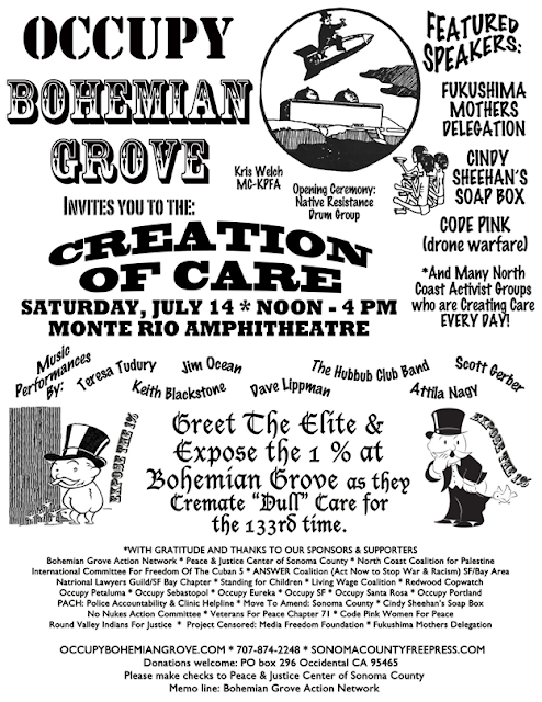The Occupy Bohemian Grove coalition is planning a four hour public assembly from noon to 4:00 on July 14. During that time there will be speakers, music and a creation of care ceremony in opposition to your cremation of care and private talks by policy elites at the Grove. KPFA radio will broadcast live from Monte Rio, No Lies Radio will video feed the proceedings on the internet, and Russia Today TV will be filming and interviewing activists.